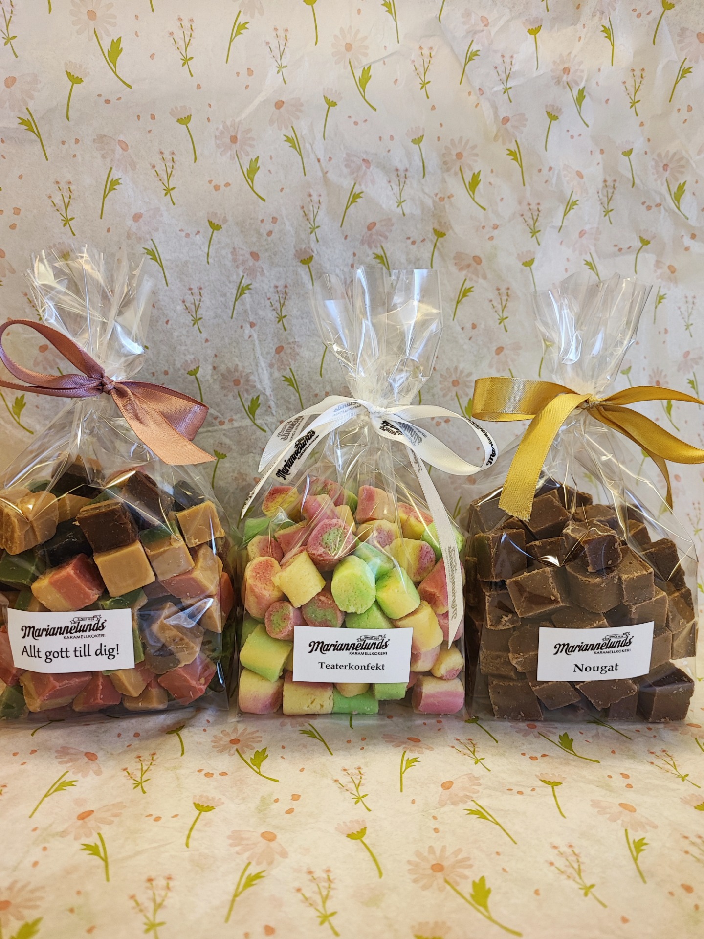 Vill du byta ut tex en nougat mot en extra teaterkonfekt eller tvärtom, (givetvis gäller det fudgen också) lämna ett meddelande vid din order så löser vi detta.